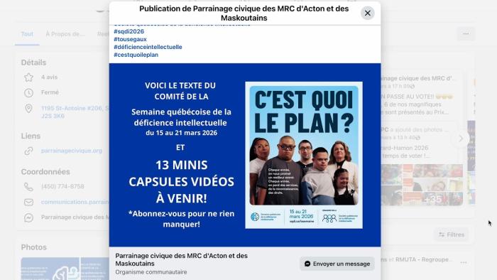 À l’occasion de la 38e édition de la Semaine québécoise de la déficience intellectuelle ayant lieu du 15 au 21 mars, le comité issu de la Table des personnes handicapées de la région de Saint-Hyacinthe a diffusé plusieurs vidéos pour mettre en valeur les personnes différentes.